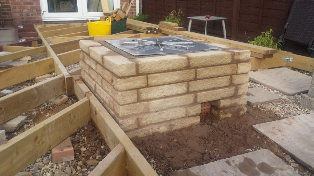 The one slight concern is lack of ventilation. Those double sized airbricks have 36 1cms holes ie. 36 square cms. Our burner requires 100 square cms. Not only that, the ventilation hole was then mostly covered by a decking beam. However he’s never reported a problem so it must be ok.
