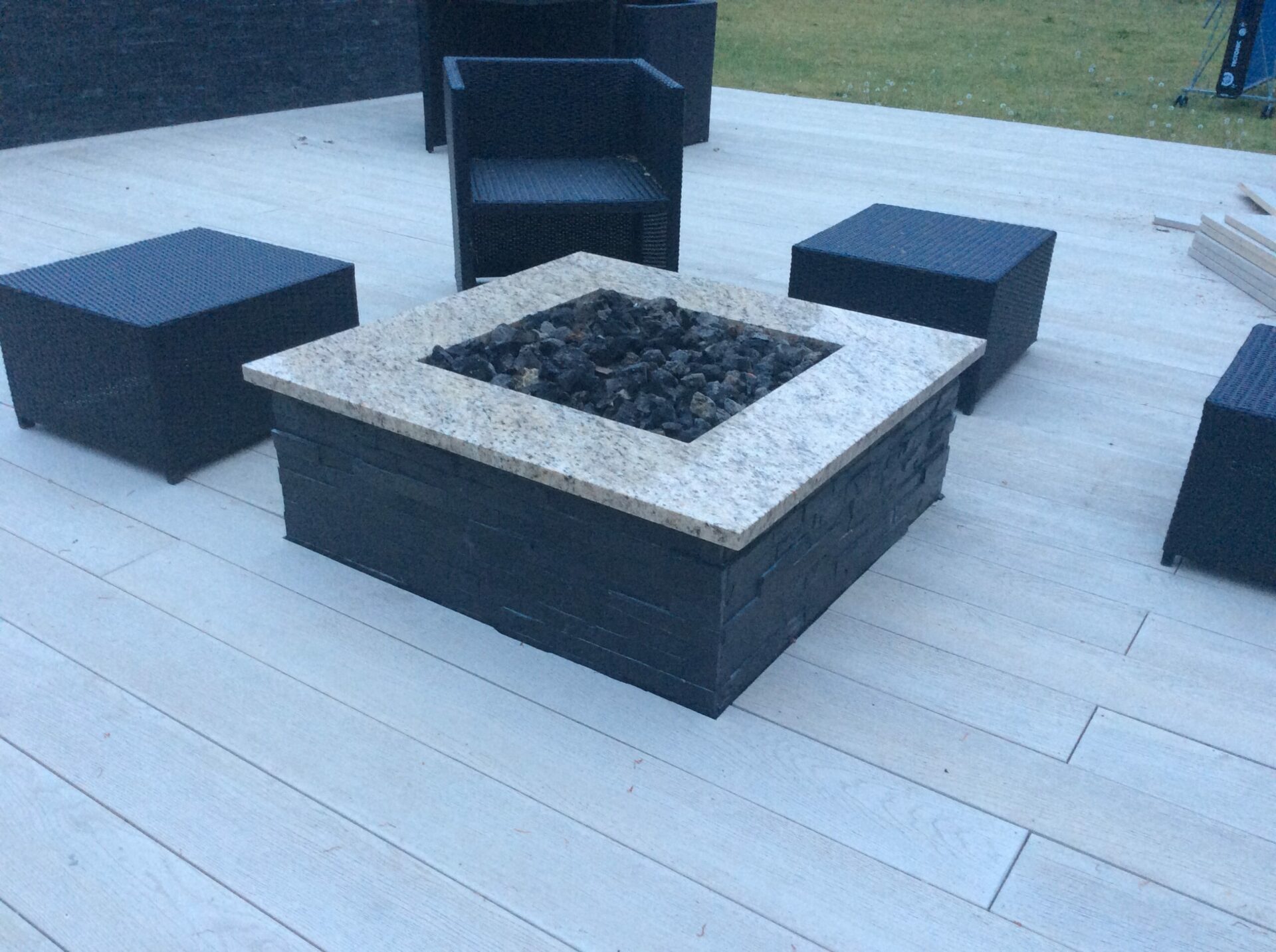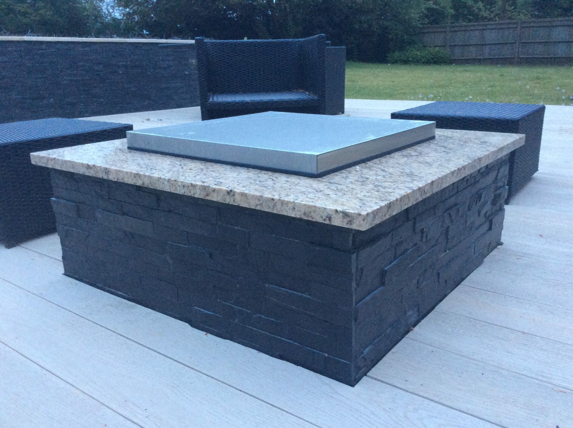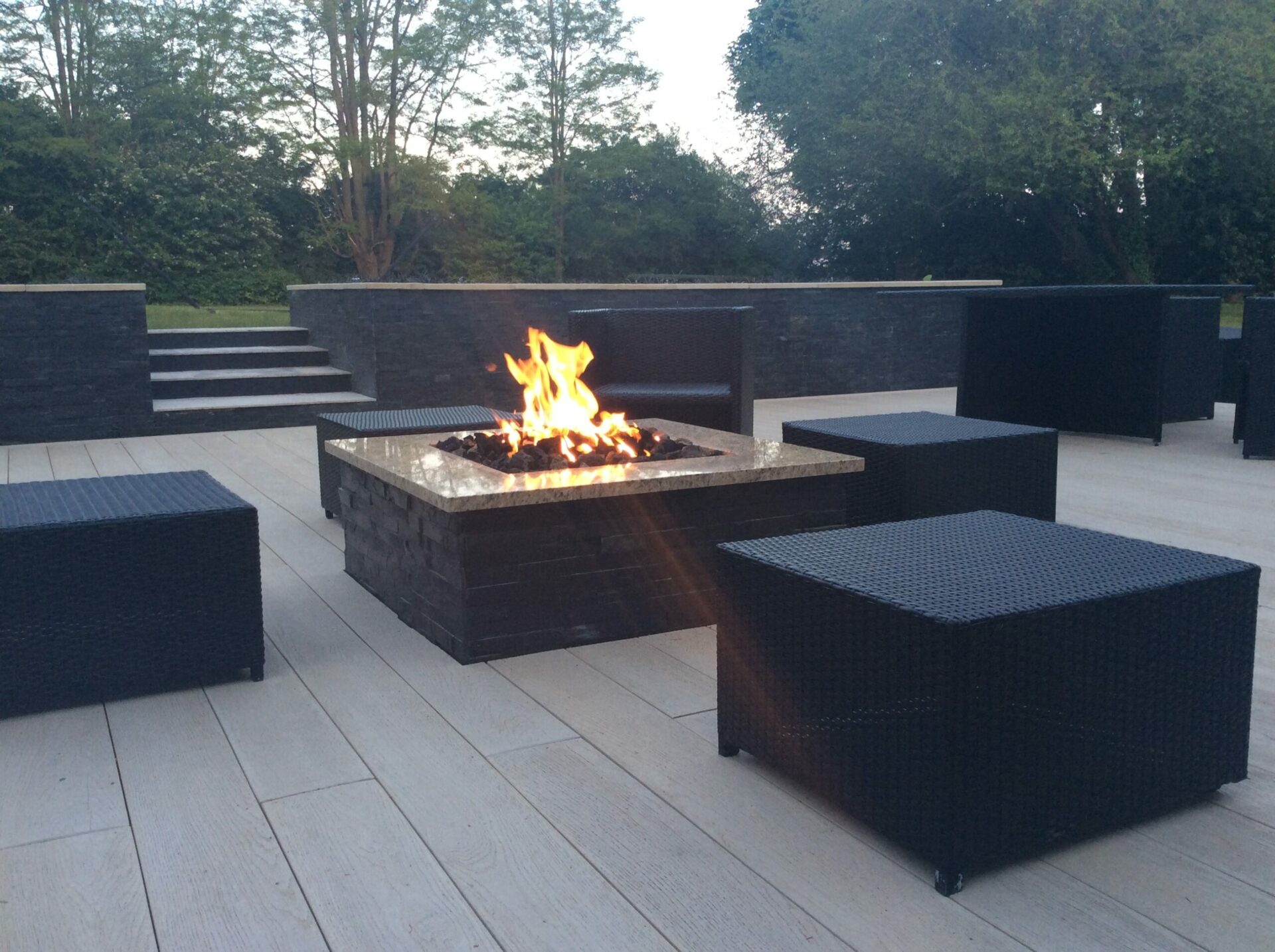 Like most firepits on decking, the firepit is built first from the ground up, then surrounded by the decking afterwards. Clean lines with no ventilation on show, as this is provided underneath the decking.
