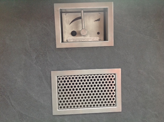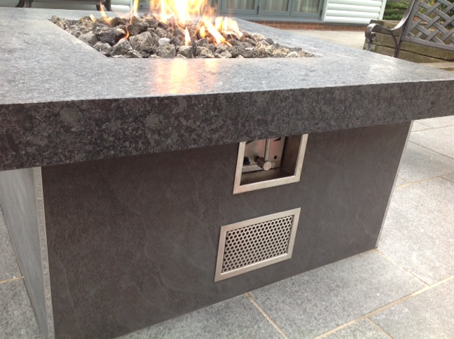 The tiles look sleek and modern with a leather look granite top to finish. This fire pit has decorative metal covers over the ventilation holes. This is acceptable as long as the area of holes still adds up to at least 100²cm. In this design there is another vent on the other side of the structure. The control box has been recessed and trimmed with a stainless steel surround.