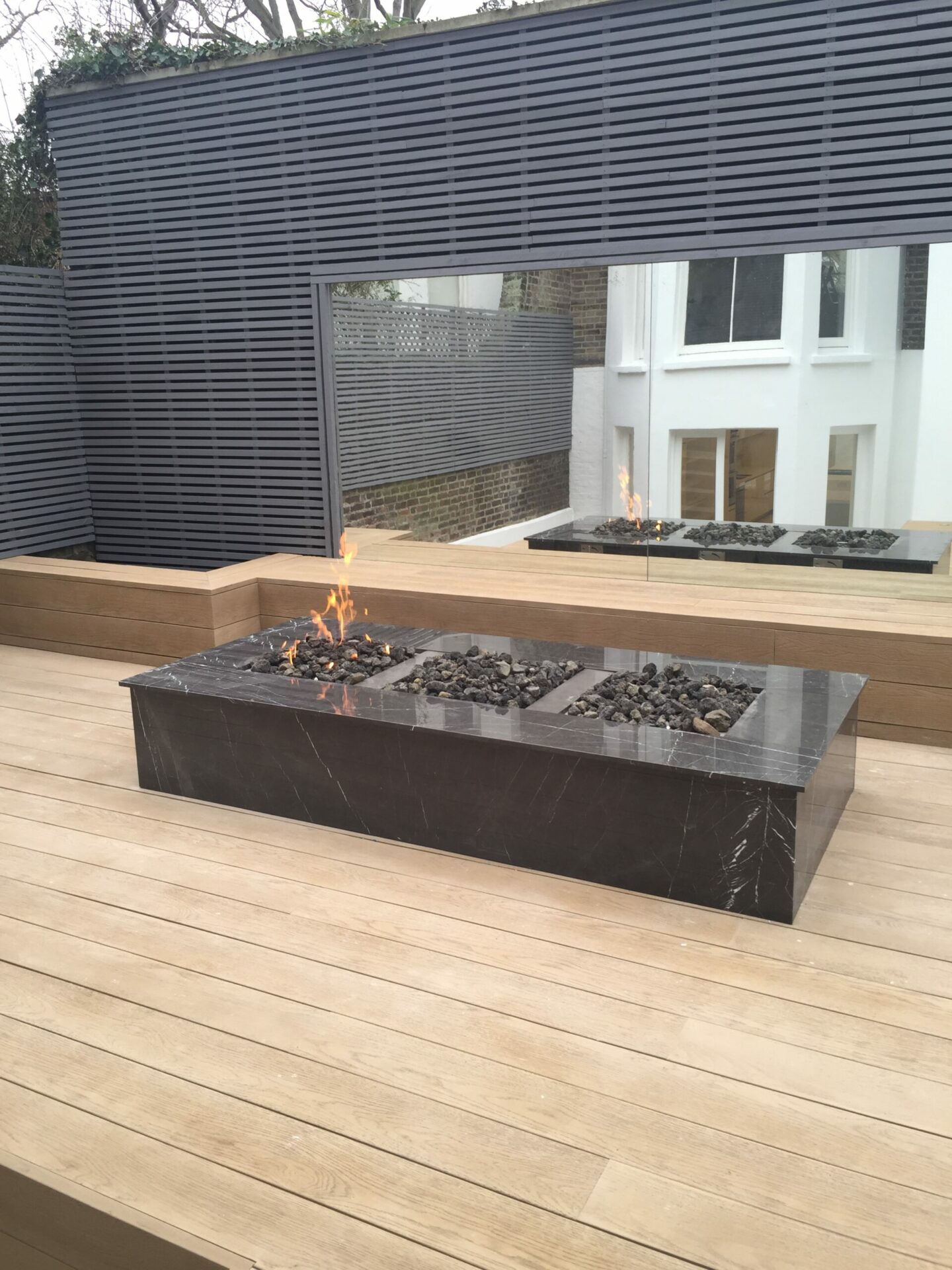An impressive triple burner firepit. This has three of our square burners installed for maximum wow factor.