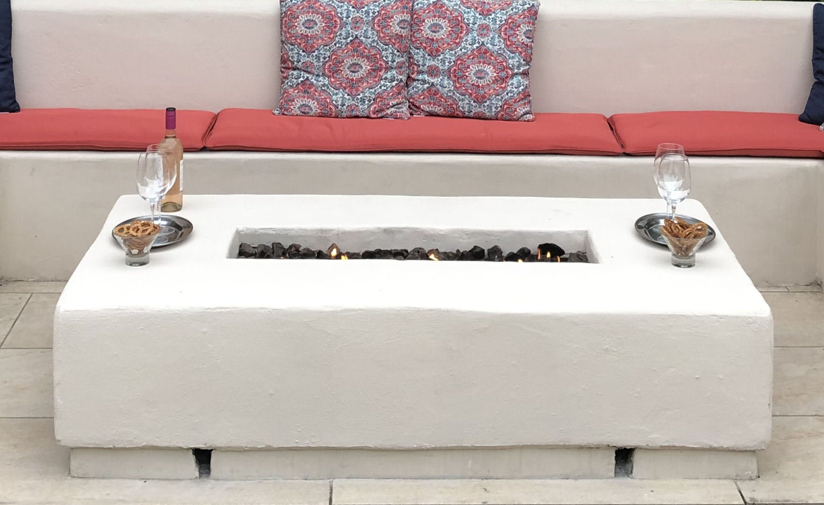 This unusual firepit and area looks like icing on a cake. Probably made from concrete blocks, but the rendering has been left slightly rough to give a softer look. Note those all important ventilation slots at the base.