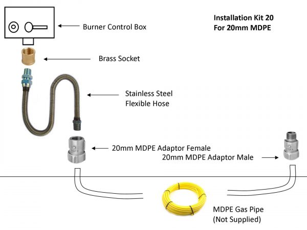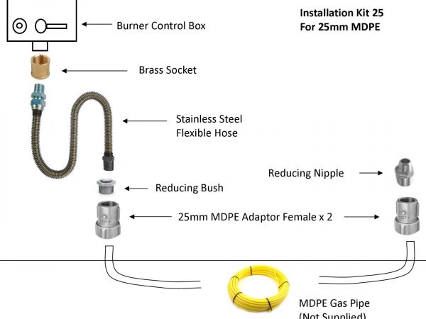 This kit has all the fittings needed when using 25mm MDPE gas pipe (pipe not supplied) Ideal for mains gas Installations up to 30mtrs from pit to gas meter Stainless steel flexible hose available in 600mm or 1,000mm length at additional cost. MDPE Installation Guide